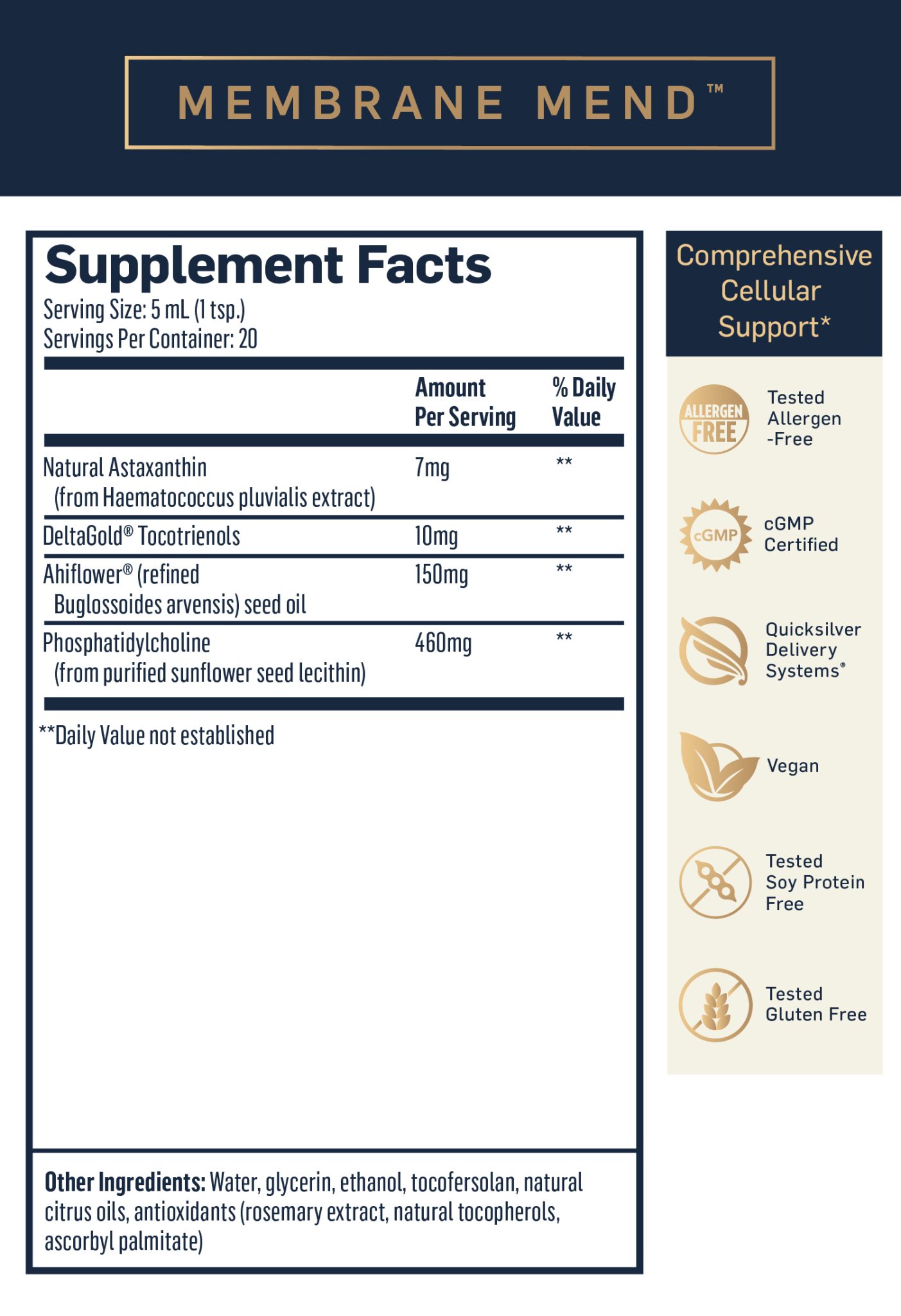 Cellular and mitochondrial membranes are the initiation point for critical signaling pathways involved in whole-body health. Damage to membranes may act as a “pacemaker” in the biological process, controlling the rate at which we age†. Nanoemulsified Membrane Mend™ delivers phosphatidylcholine, the building block of cell and mitochondrial membranes, along with plant-based essential fatty acids and potent membrane antioxidants to support healthy functioning cells as we age.*