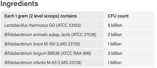 Lactobacillus rhamnosus GG helps support beneficial gut flora during antibiotic use in healthy infants over 6 months and healthy children and relieves symptoms of mild eczema/dermatitis in healthy infants over 6 months and children.