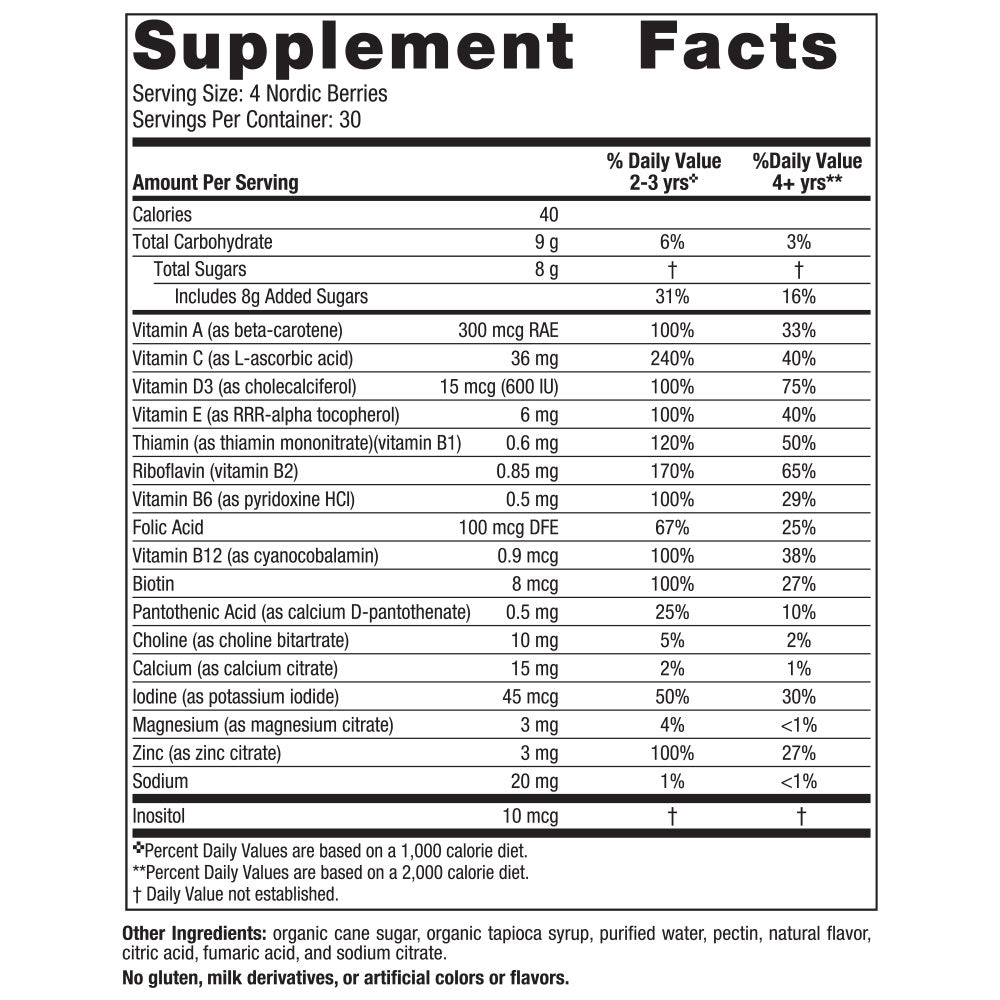 Chewable, pectin-based multivitamin for ages 2+Provides essential vitamins and minerals that growing kids need,including zinc and vitamins A, B, C, D3, and EDelicious sweet-and-sour tasteNo artificial coloring, flavoring, or preservativesIdeal companion to any Nordic Naturals omega-3 product.