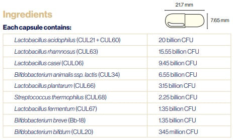 UltraBiotic 60 contains probiotics, including clinically trialled Lab4 strains L. acidophilus (CUL21 + CUL60), B. animalis ssp. lactis (CUL34), B. bifidum (CUL20), that support digestive system health and function, relieve abdominal bloating and help maintain beneficial gut flora including during antibiotic use. Streptococcus thermophilus aids in the digestion of lactose. UltraBiotic 60 contains Lab4 strains that are shown to support bowel health and function.